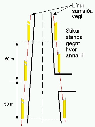 Þar sem stikur eru báðum megin vegar skulu þær standa gegnt hvor annarri.