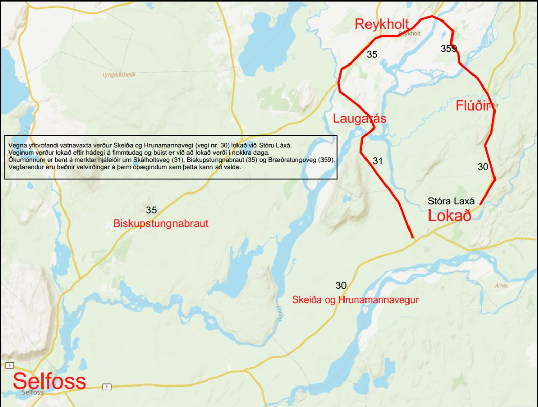 Skeiða- og Hrunamannavegur lokaður (hjáleið): Vegna yfirvofandi vatnavaxta þurfti að rjúfa Skeiða- og Hrunamannaveg við brúna yfir Stóru-Laxá. Þetta er gert til að vernda nýja brú sem er í smíðum en þrengt hefur verið að árfarveginum og lítið svigrúm fyrir vatnavexti. Veginum var lokað um hádegisbil fimmtudaginn 19. janúar og búist er við að lokað verði í nokkra daga. Ökumönnum er bent á merktar hjáleiðir um Skálholtsveg (31), Biskupstungnabraut (35) og Bræðratunguveg (359).