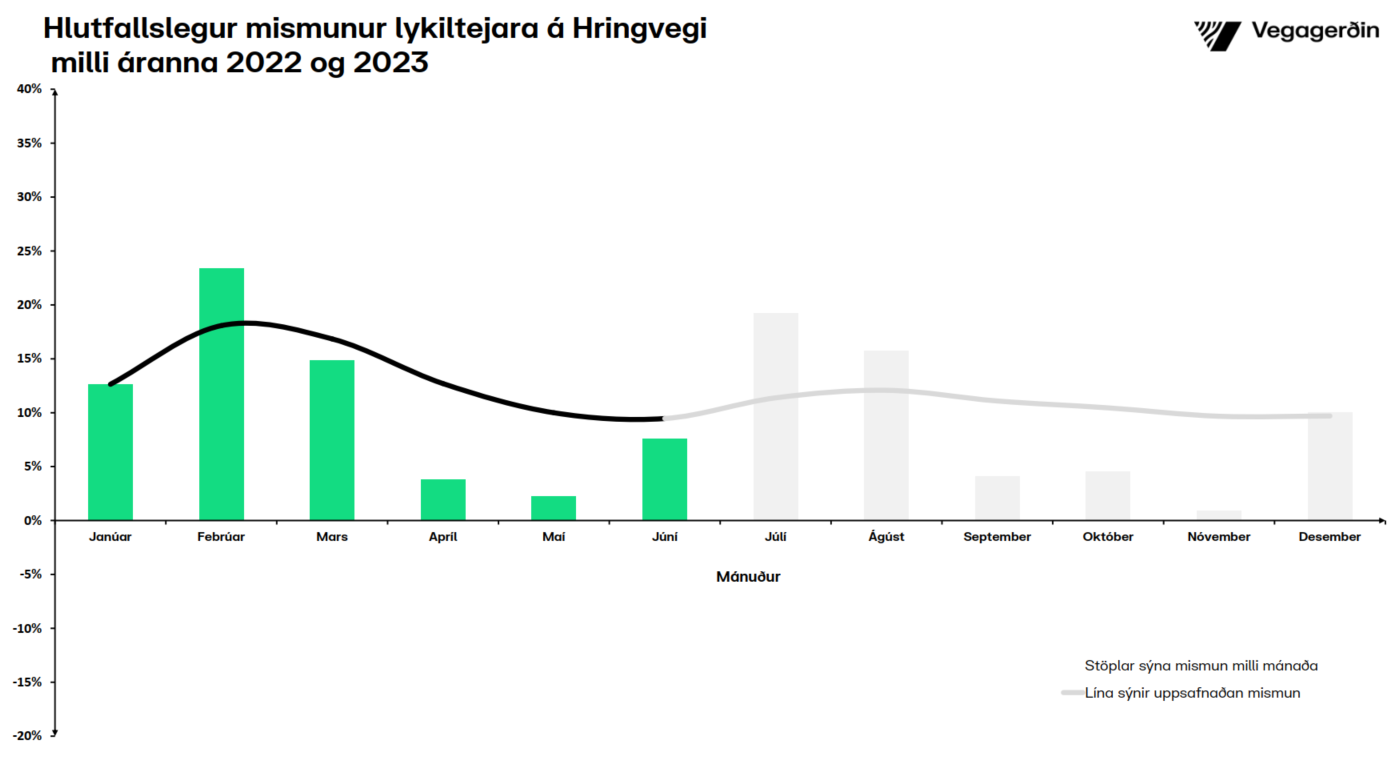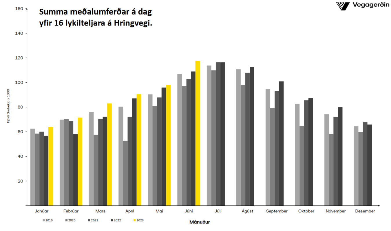 Nýtt met var mælt í umferð, yfir 16 lykilteljara Vegagerðarinnar á Hringvegi, en aldrei áður hafa mælst jafn mörg ökutæki á Hringveginum og í nýliðnum júnímánuði. Umferðin jókst um 7,6% borið saman við sama mánuð á síðasta ári. Leita þarf aftur til ársins 2017 til að finna meiri hlutfallslegan vöxt milli júní mánaða. Þessi aukning er rúmlega tvisvar sinnum meiri en í meðalári. Ólíklegt er talið að júní mánuður haldi þessu umferðarmeti þar sem bæði júlí og ágúst hafa, sögulega séð, mælst með meiri umferð. Það verður því fróðlegt að sjá niðurstöður þessara mánaða, þegar þær liggja fyrir.