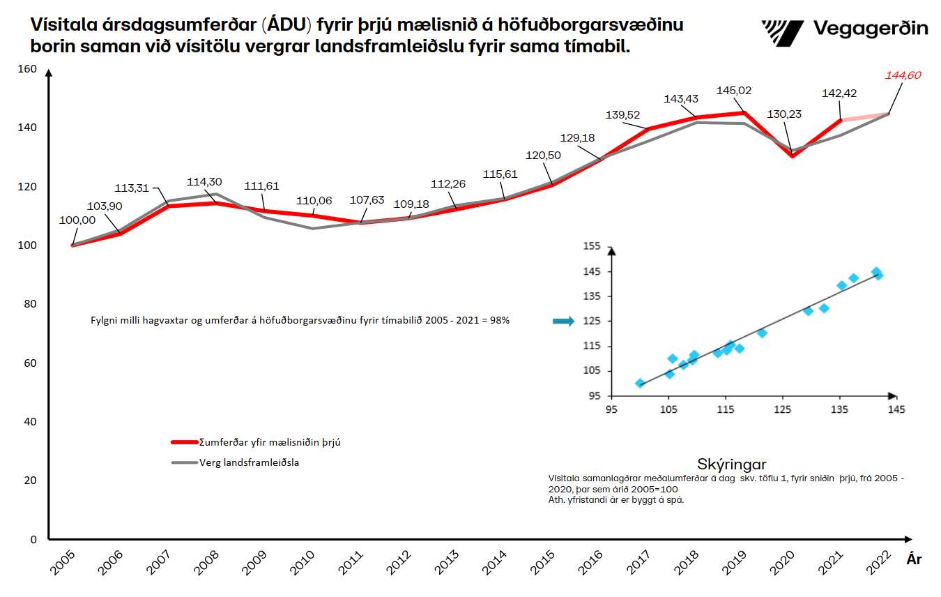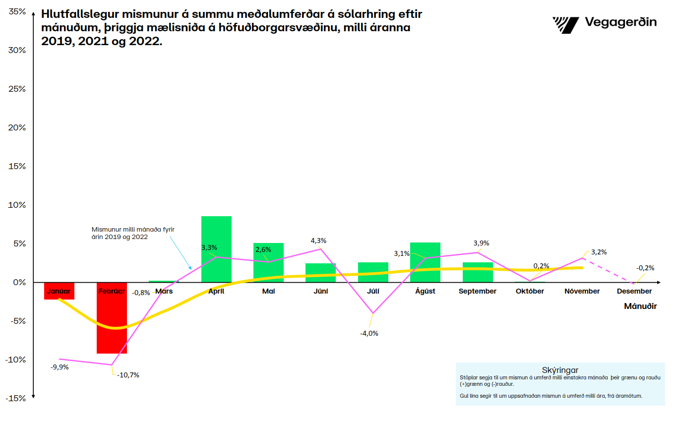 Nú þegar aðeins einn mánuður er eftir af árinu 2022 eru allar líkur til þess að umferðin verði í kringum 1,5% meiri en hún var á síðasta ári, á höfuðborgarsvæðinu. Gangi þessi spá eftir verður umferðin í ár samt sem áður rétt undir 2019 umferðinni.