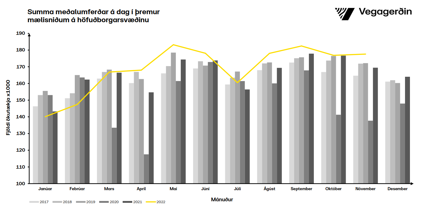 Umferðin í nóvember á höfuðborgarsvæðinu jókst um nærri fimm prósent sem leiddi til þess að met var slegið. Umferðin hefur aldrei verið meiri í nóvember en ekki er útlit samt fyrir að met verði slegið í ár en umferðin verður líklegast rétt undir því sem hún var árið 2019 þegar allt 2022 verður gert upp.