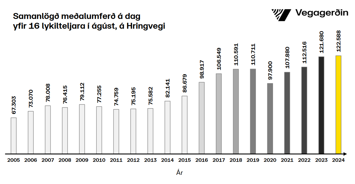 Til samanburðar hefur samtalsumferð um mælisniðin 16 aukist árlega um 3,2%, milli áranna 2005 til 2023. Svo nú eru miklar líkur á því að umferðaraukningin, í ár verði undir meðallagi.