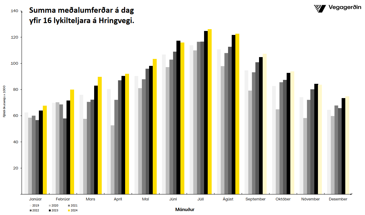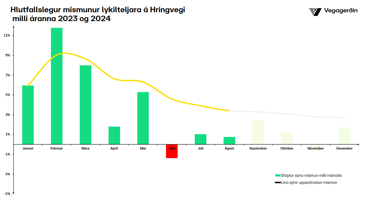 Umferð jókst einungis um 0,7% milli ágúst mánaða 2023 og 2024. Þetta er þriðji mánuðurinn í röð, sem sýnir mjög litla aukningu eða samdrátt.