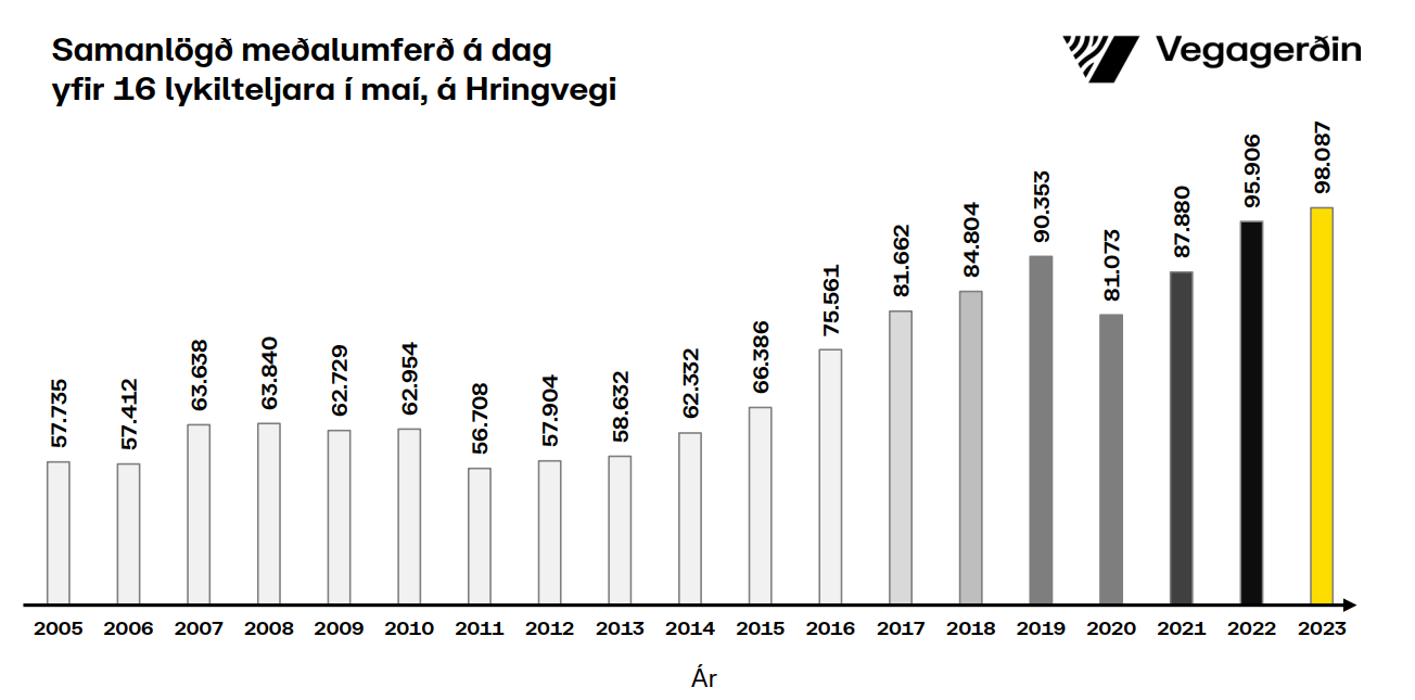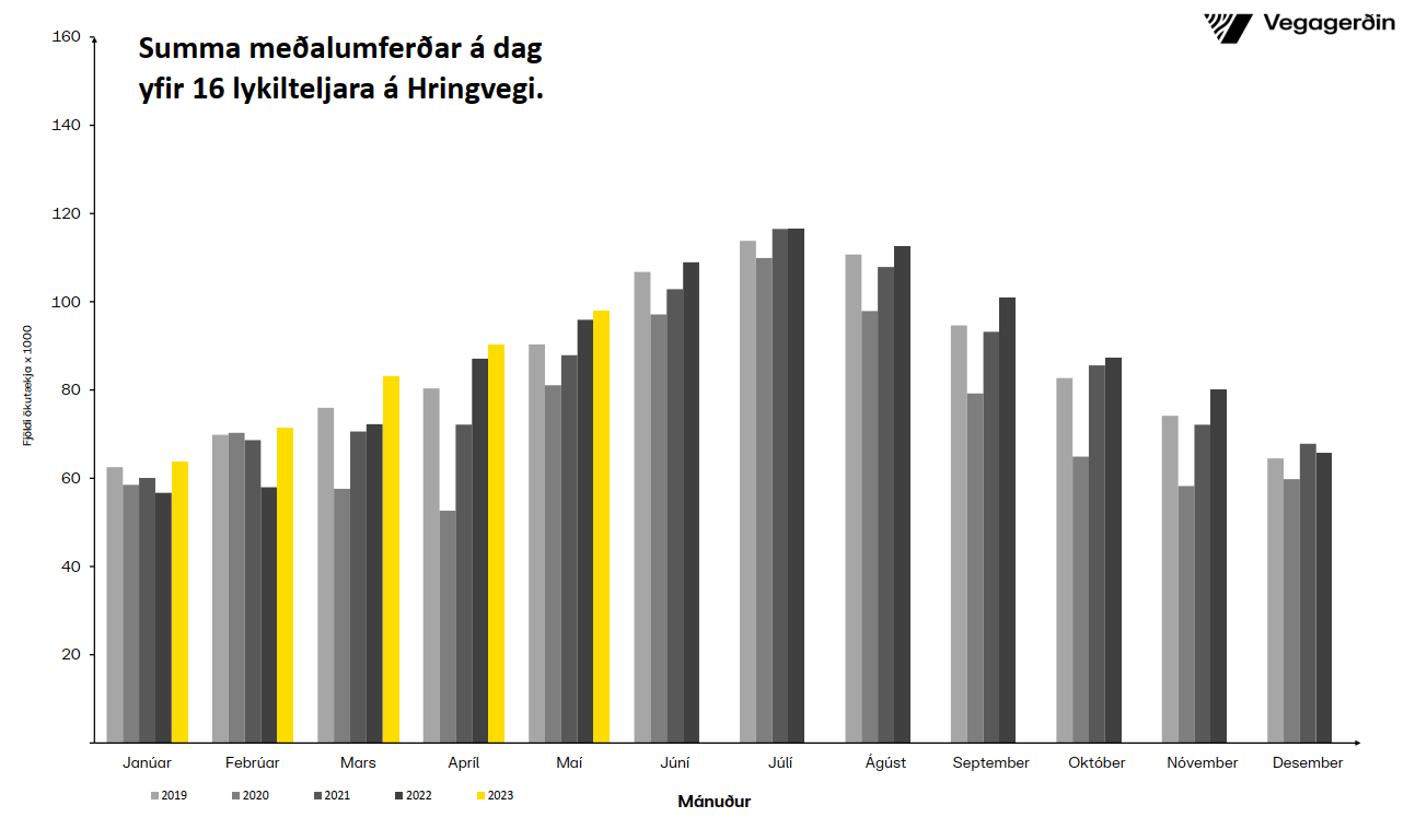 Umferðin jókst um 2,3% milli maí mánaða árin 2022 og 2023, yfir 16 lykilteljara Vegagerðarinnar á Hringvegi. Þessi aukning varð til þess að nýtt umferðarmet var slegið í maí mánuði, en fyrra met var frá síðasta ári.